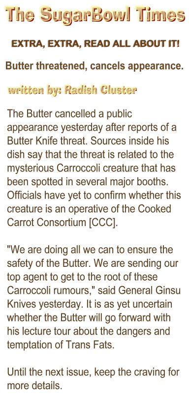 Good news!! General Ginsu Knives just wrote saying that I'll be starting on a new mission! I'm going to find the Carroccoli creature and end the threat to the Butter! As the Butter might have crucial information on the whereabouts of the Dinner Guest, I can cut two beets with one chop.